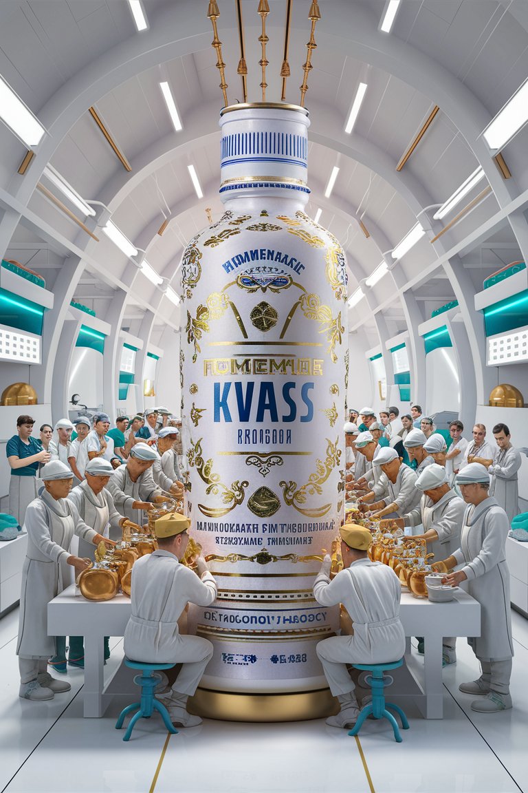 promt: the factory where a futuristic and innovative home kvass making kit is being developed, showcasing an elegant and smart kit with a distinctly Russian identity. We see a general layout of the factory with a crowd of workers working on the product. The general atmosphere of the image is cleanliness, high technology and celebration of Russian culture and traditions. Main colors: white, blue, gold