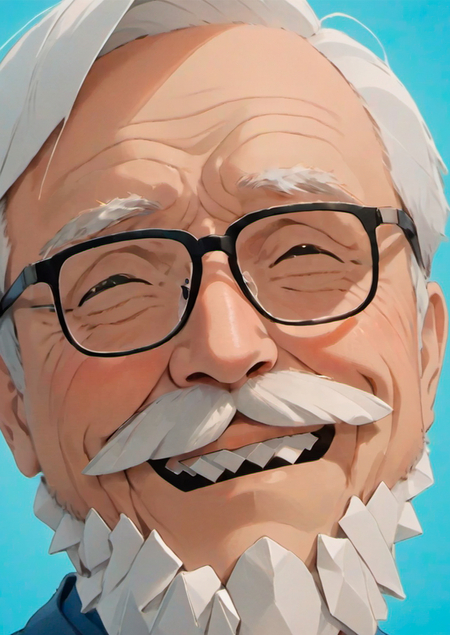 Промнт: 1boy, beard, black-framed eyewear, blue background, blue sky, closed eyes, face, facial hair, glasses, looking at viewer, male focus, mustache, old, old man, open mouth, portrait, realistic, smile, solo, teeth, wrinkled skin
