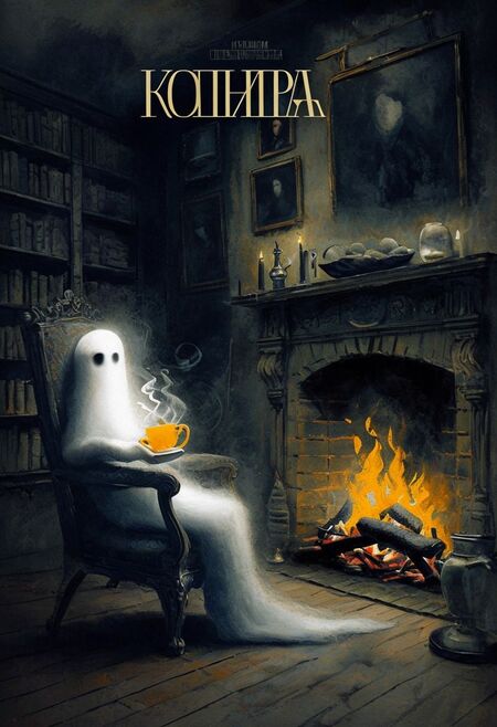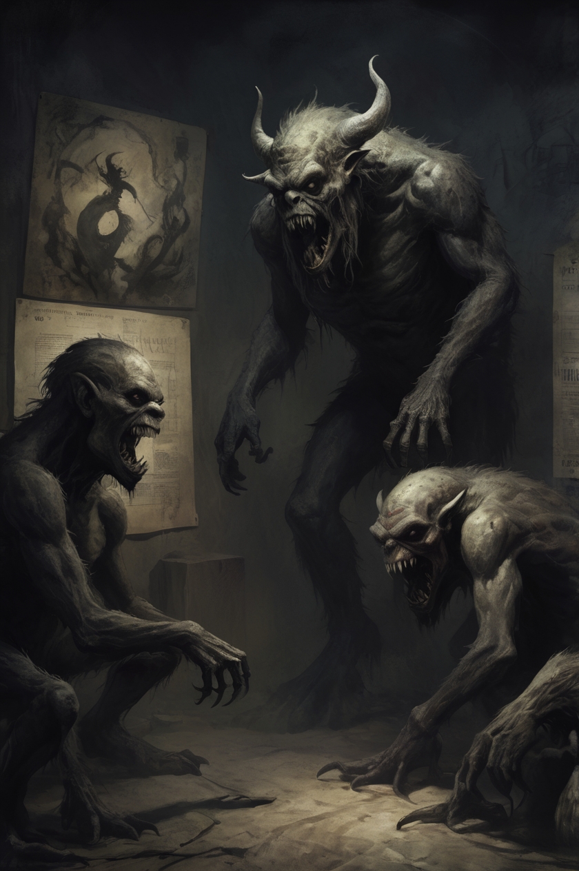 posters with mystical creatures for the museum «nightmare», impressionist, mixed media, ominous, muted, dramatic chiaroscuro