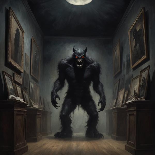 Promt museum poster «nightmare», impressionist, mixed media, ominous, muted, studio lighting with black monster