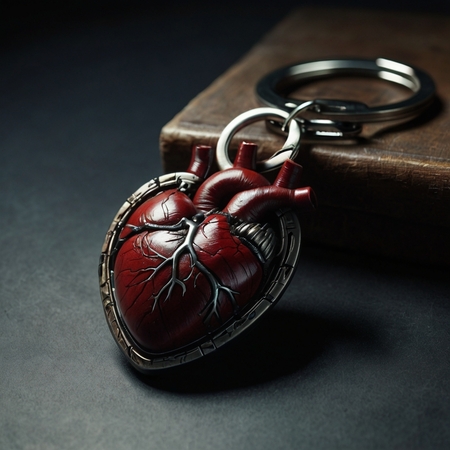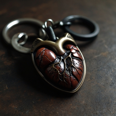 Promt phone keychain with anatomical heart, photorealistic, photography, ominous, muted, studio lighting