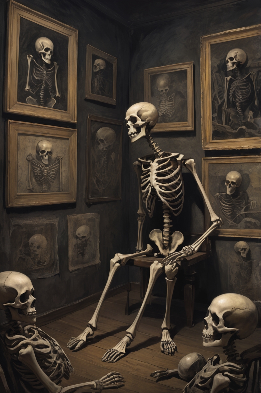 posters with skeletons for the museum «nightmare», impressionist, mixed media, ominous, muted, dramatic chiaroscuro