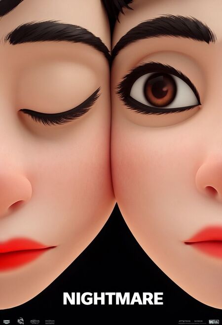 Promt a minimalistic vector logo for horror animation named «NIGHTMARE», clay style, blak lettering, vivid colours, white background, black monster with scary face