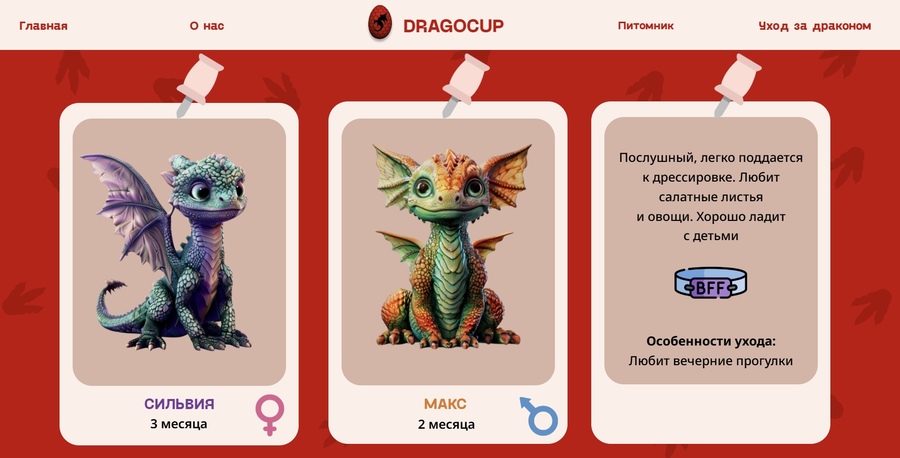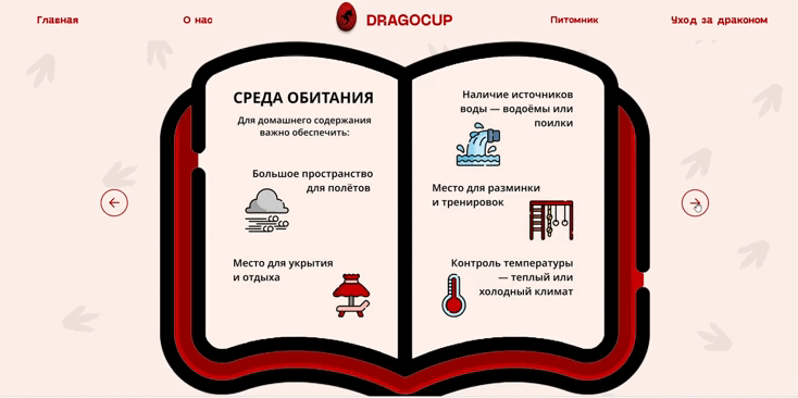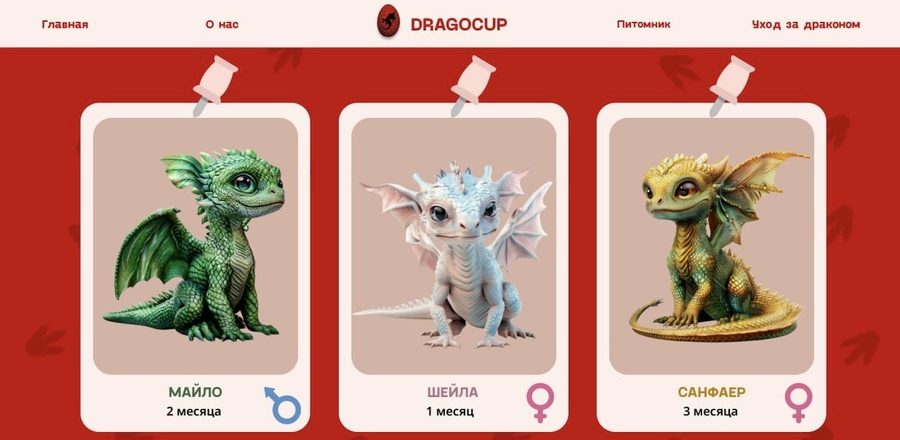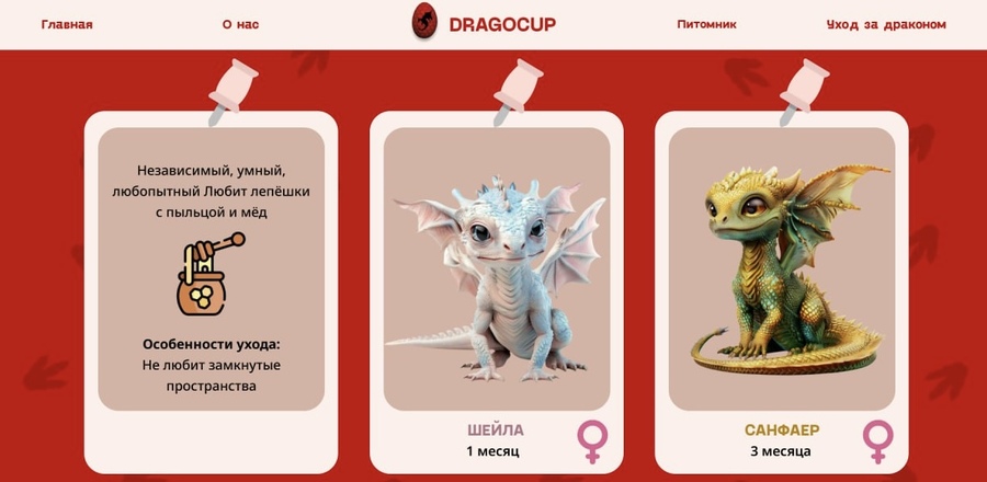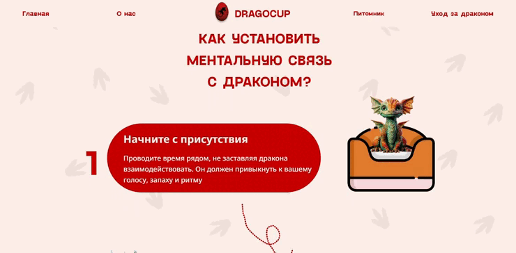 Мультимедийный сайт для бренда «DRAGOCUP» предлагающий выбрать собственного дракона, прочитать методичку по уходу за драконом и возможность получить приятные бонусы за приобретения дракончика