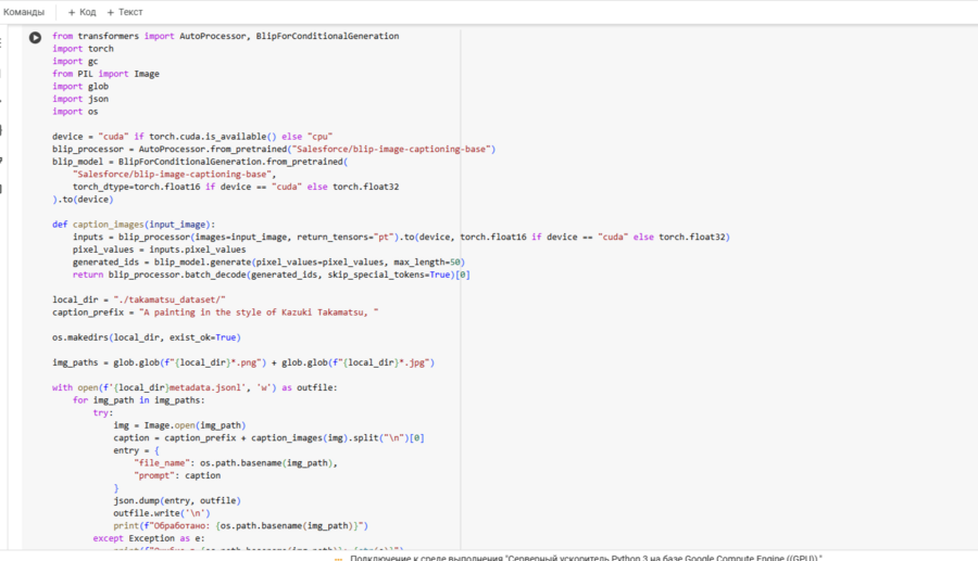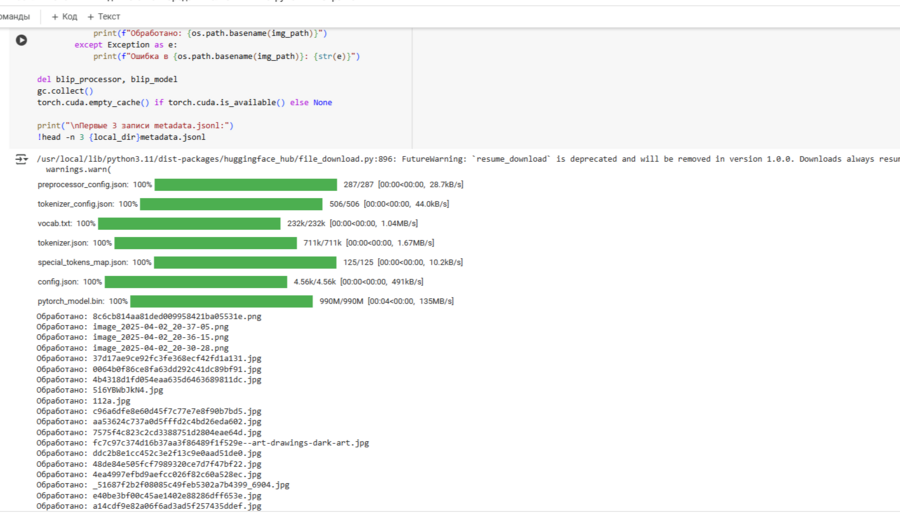 Код для загрузки изображений и генерация описаний с помощью BLIP