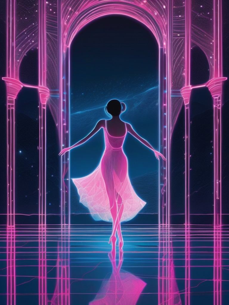 A lonely dancer in the style of Kazuki Takakamatsu: 1. Semi-transparent body with glowing neon-blue contours 2. Standing in dark infinite space with misty atmosphere 3. Pastel pink-to-blue gradient lighting 4. Ultra-detailed line work 5. 8K resolution, digital painting