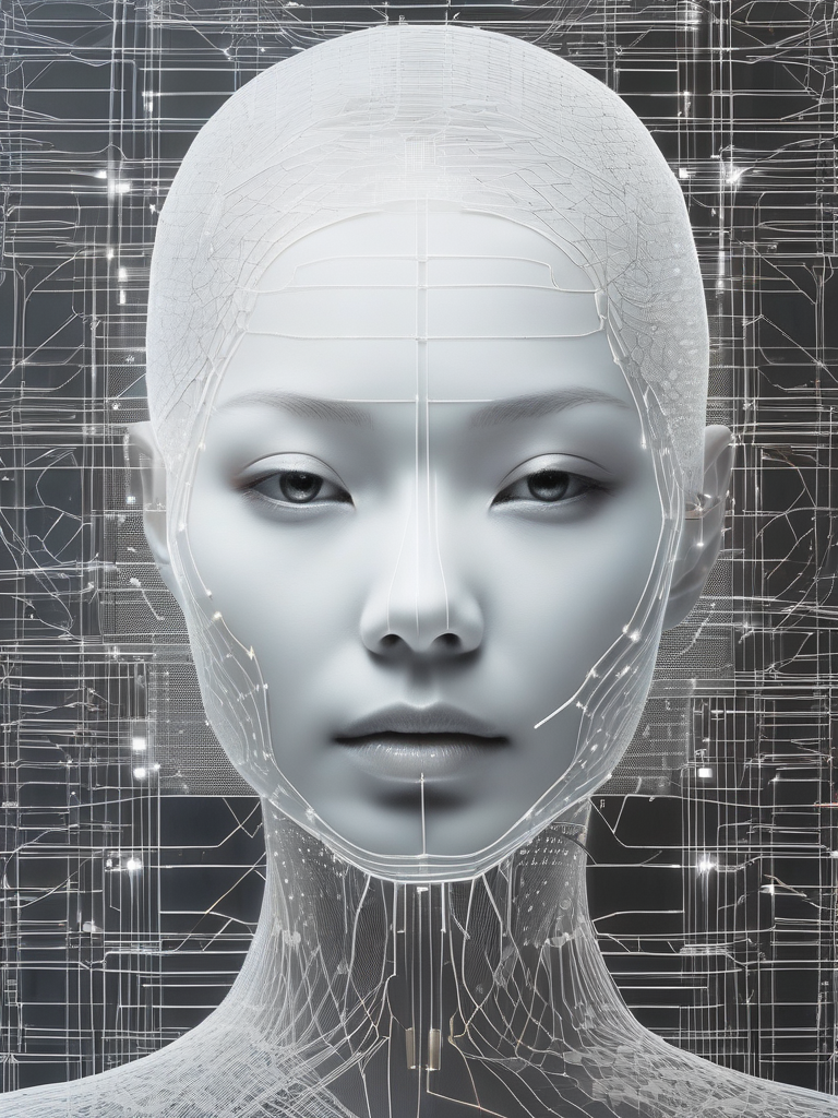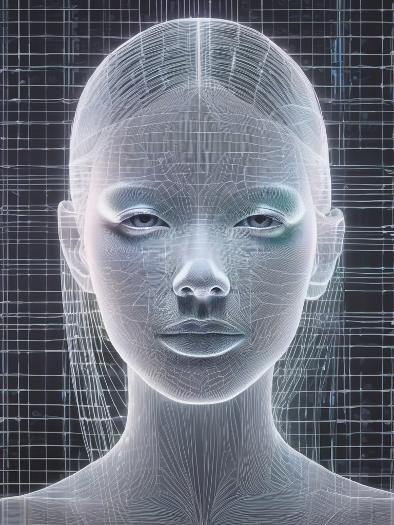 Ultra-detailed portrait in Kazuki Takamatsu’s signature style: 1. Pale female face with glowing #4870ff wireframe contours 2. Semi-transparent skin (70% opacity) revealing inner #ff00c1 vascular structure 3. Background: vertical gradient #0a0a1a → #1e0037 (exact match to dataset) 4. Technical: — 0.5px line thickness — 8px glow radius — 17-degree head tilt — Asymmetrical eye dissolution 5. Color palette restrictions: — Only #4870ff, #ff00c1, #00f7ff — No warm yellows/oranges 6. 8K resolution, studio quality
