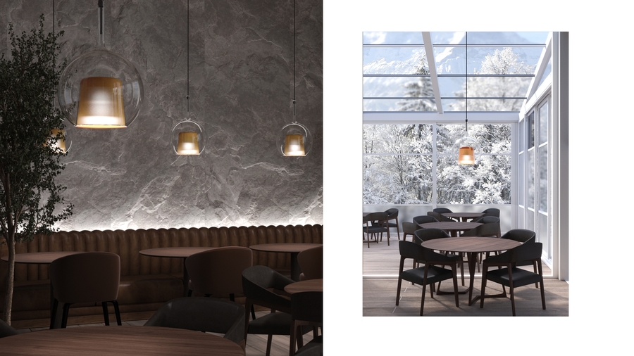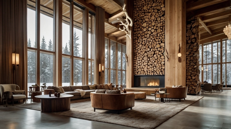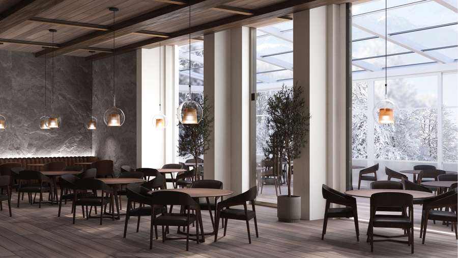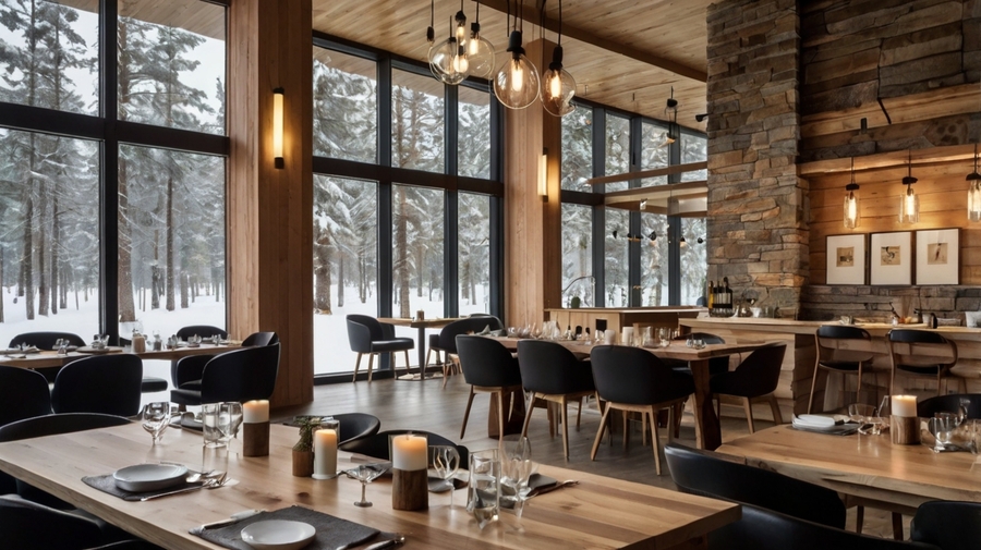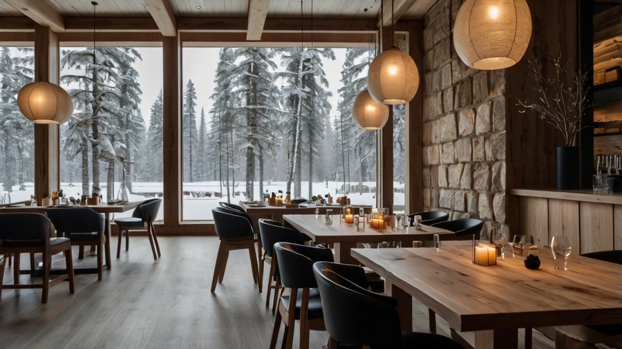 A modern restaurant interior in the Komi Republic, designed with natural elements and a warm, minimalist aesthetic. The space features large floor-to-ceiling windows that provide views of a snowy winter landscape. The interior combines light-colored walls, textured stone surfaces, and wooden flooring. The ceiling is accented with wooden beams, and elegant pendant lights with glass shades hang over the tables. The dining area consists of dark wooden tables paired with sleek black chairs, offering a balance of sophistication and comfort. Potted trees add a touch of greenery, enhancing the connection to nature. The atmosphere is cozy, stylish, and inviting, with a serene winter backdrop.