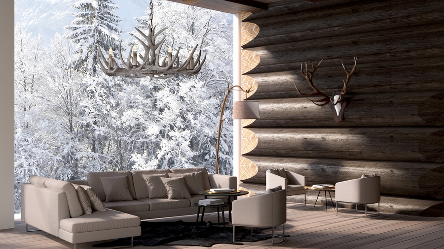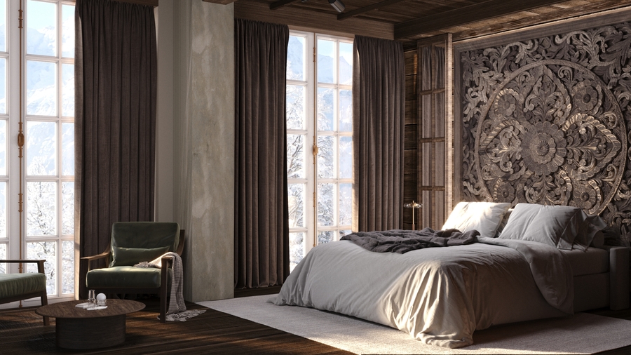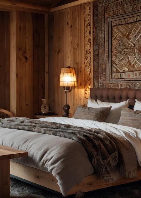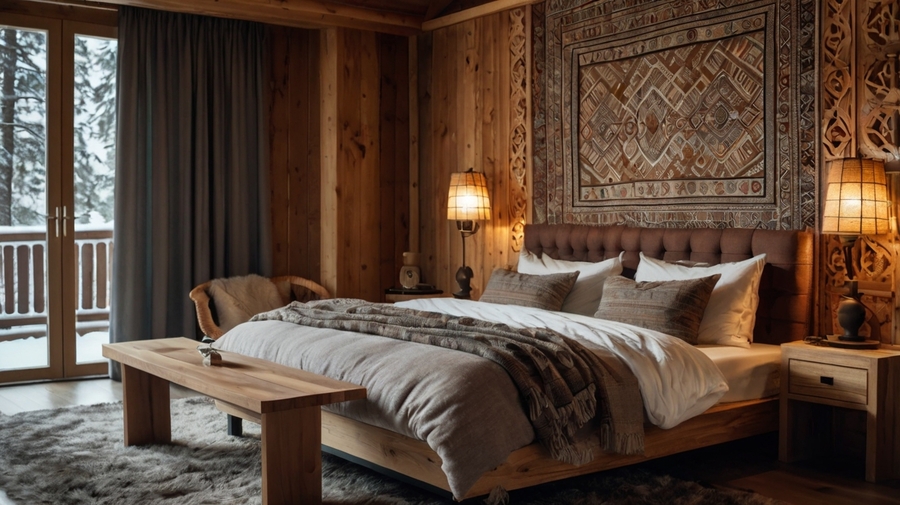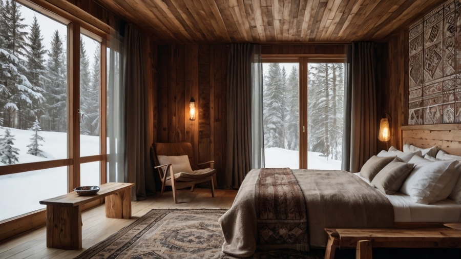 A cozy hotel room in the Komi Republic with ethnic design elements. The interior features warm, natural tones: wooden walls and ceiling, soft brown curtains framing large panoramic windows that overlook a snowy winter forest. A large double bed with gray bedding and a plush throw is the focal point of the room. The headboard is adorned with an intricately carved wooden panel featuring traditional ethnic patterns. By the window, there’s a comfortable armchair with a cozy blanket and a small wooden coffee table. The atmosphere is warm and relaxing, reflecting harmony with nature and the traditions of the northern region.