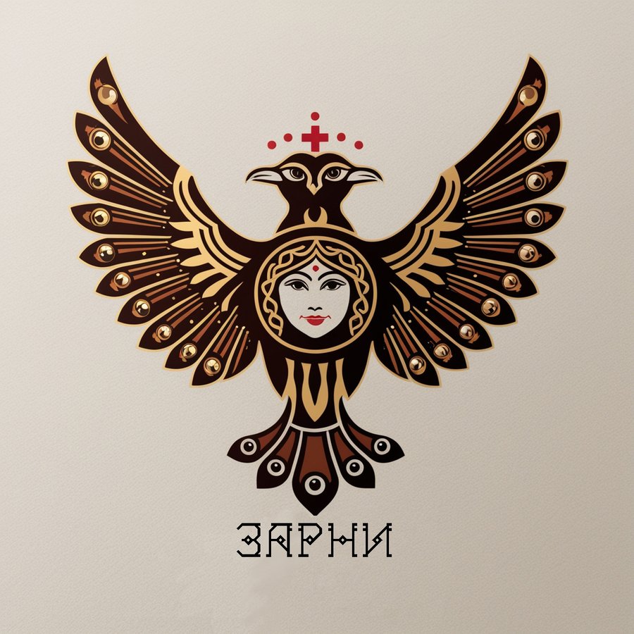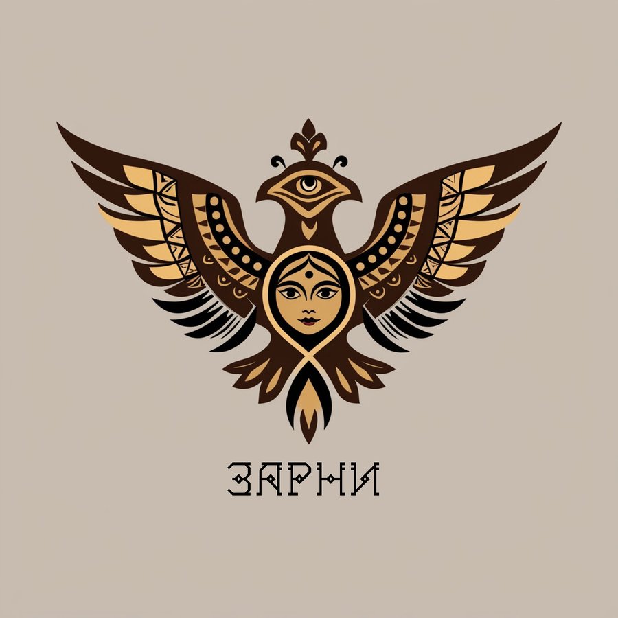 Create a logo inspired by the traditional symbolism and the image provided. The design should feature a stylized bird or eagle with intricate details, including multiple eyes and a central female face symbolizing wisdom and mythology. Use a color palette of gold, brown, and black, avoiding red. The bird’s wings should incorporate patterns reminiscent of northern ethnic motifs, such as geometric lines, dots, and stylized feathers. The design should evoke a sense of cultural heritage, power, and mysticism while remaining modern and clean, suitable for branding and digital applications