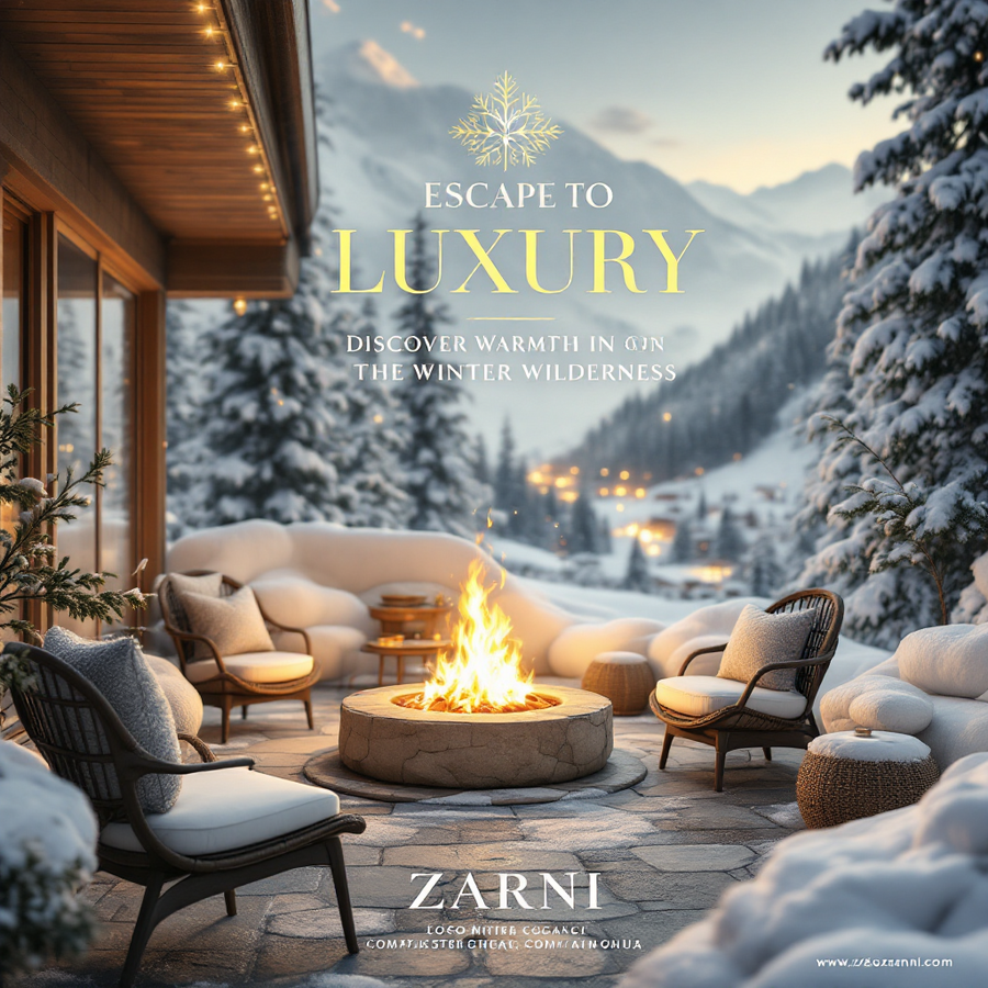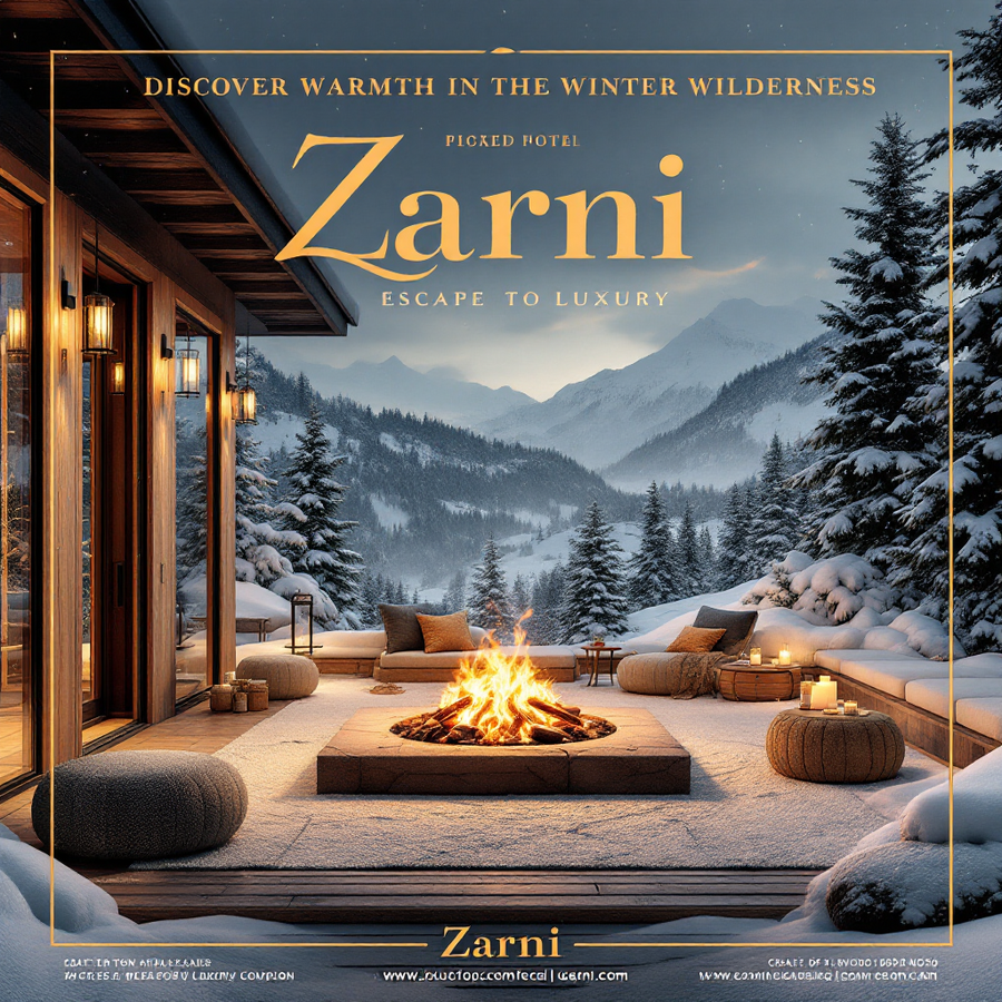 Create an advertising poster for Zarni hotel, inspired by a luxury winter escape theme. The poster should feature a stunning outdoor scene with snowy landscapes, a warm firepit or cozy seating area, and natural wooden or stone textures. Use a sophisticated color palette of gold, brown, and white. Include elegant, bold typography with phrases like 'Escape to Luxury' or 'Discover Warmth in the Winter Wilderness.' Incorporate the Zarni logo and contact information at the bottom. The overall design should evoke comfort, exclusivity, and a serene connection to nature.