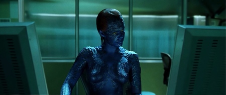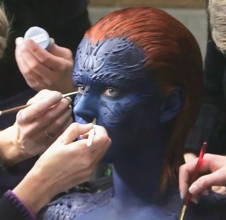 Однако, несмотря на изобилие технологий, Дженнифер Лоуренс — актриса, исполнившая роль Мистик была вынуждена наносить грим и силиконовые накладки, так же как и в первых версиях фильма, но он потерпел трансформацию на более предсказуемый материал из-за сильной аллергической реакции на компоненты краски. Грим заменили на ростовой обтягивающий костюм, который избавил от необходимости наносить большое количество слоёв красителя, а также позволил добиться однородного цвета кожи, без угрозы повреждения.