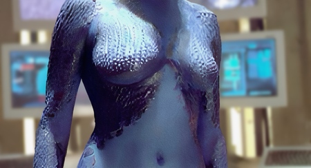 Запрос к созданию внешнего облика заключался в том, чтобы сделать Ребекку Ромейн обнаженной с элементами чешуи. Команда по спецэффектам и гриму начала тестировать эту задумку еще до приглашения актрисы. Разработав план по визуальной части персонажа, специалисты пришли к выводу, что только грудь будет полноценной 3D накладкой, остальная же часть накладок должна остаться плоской и наноситься напрямую на тело, не отличаясь от работы портного с кусочком ткани.