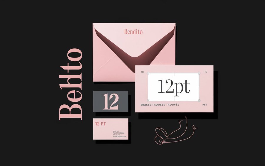 /imagine prompt: make a mockup of printed products (envelope, business card, paper), on a black background, the mockup look like bendito, collection Objets Trouvés, studio light, looks like an expensive layout, on the light modern style business card itself the logo «12 pt» is gray and pink, the font is Acta Dispay Book, vibe like program inDesign, underscores are all sorts of things like in the indesign program when you write text, highlighting text