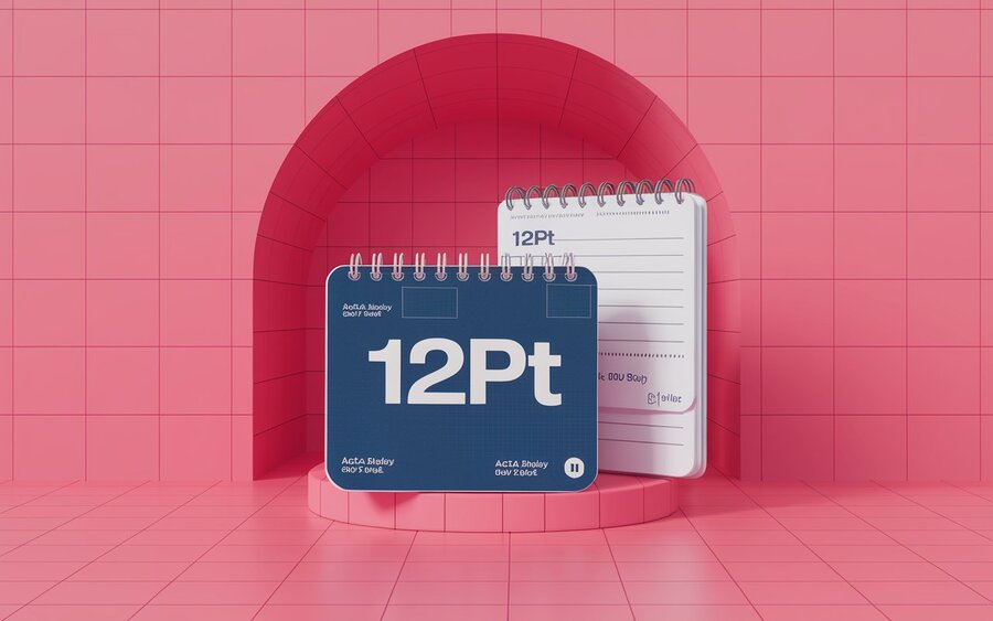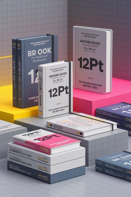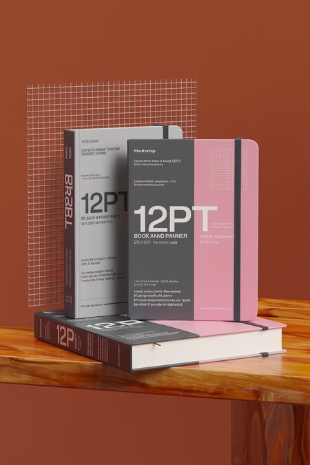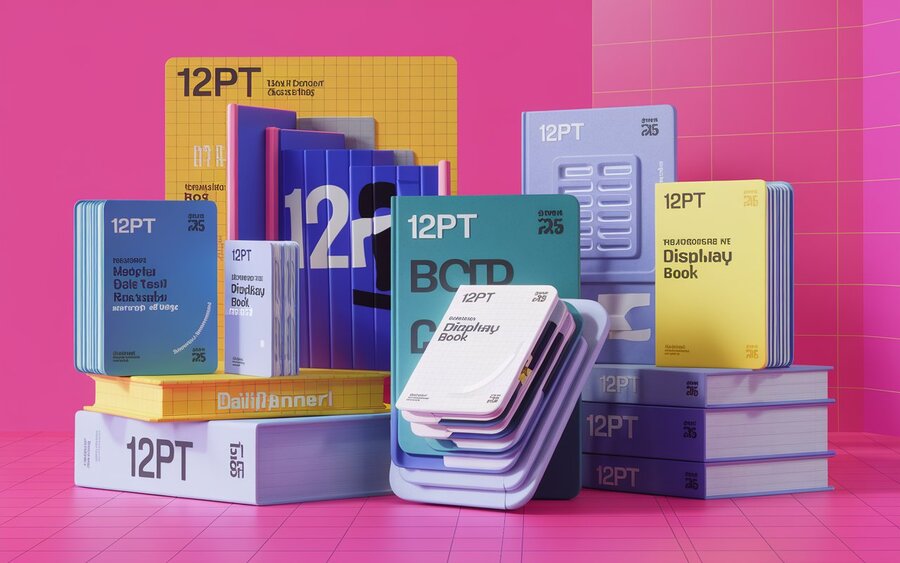 /imagine prompt: create a design of 3D rendering of models of books and daily planner for «12pt» brand of book design festival. font — Acta Dispay Book, style of program inDesign, a grid of inDesign, using gray and pink, expensive 3d render elaborated, with expensive books that differs from other products, bright colors on the background, juicy colors