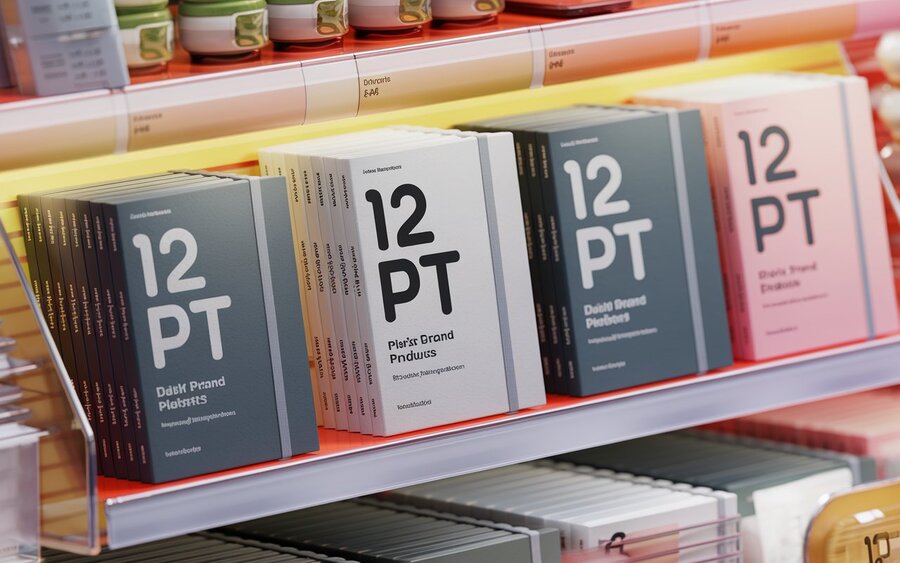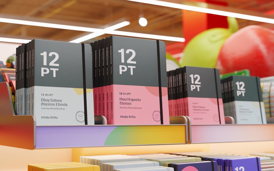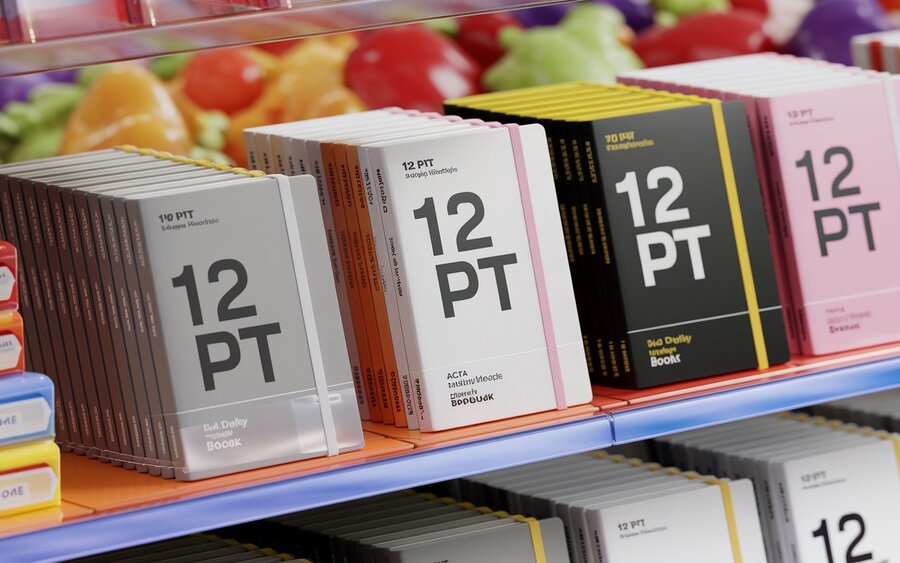 /image prompt: A 3D render of «12 pt» brand of books and daily planners, book design festival, books displayed on a supermarket shelf. The books have a modern design with modern vibe, gray and pink. The books are positioned alongside other products. The overall atmosphere of the image is warm and modern, font — Acta Dispay Book, style of program inDesign, a grid of inDesign, using gray and pink, expensive 3d render elaborated, with expensive books that differs from other products, bright colors on the background, juicy colors