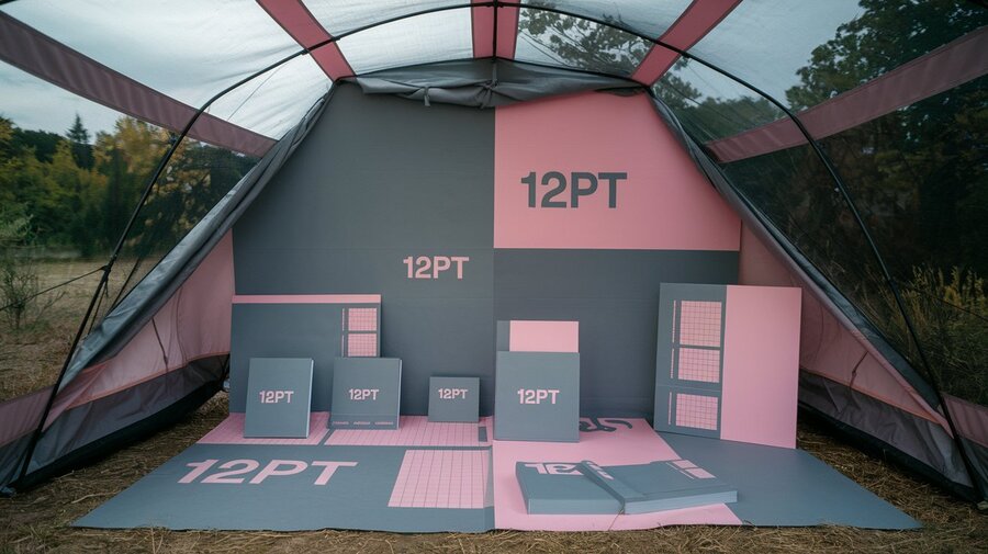 prompt: make the interior of the tent, which is located at the book design festival of the books and daily planners «12pt», the colors gray and pink, font Acta Dispay Book, nature, summer, style of program inDesign, a grid of inDesign, using gray and pink, juicy colors
