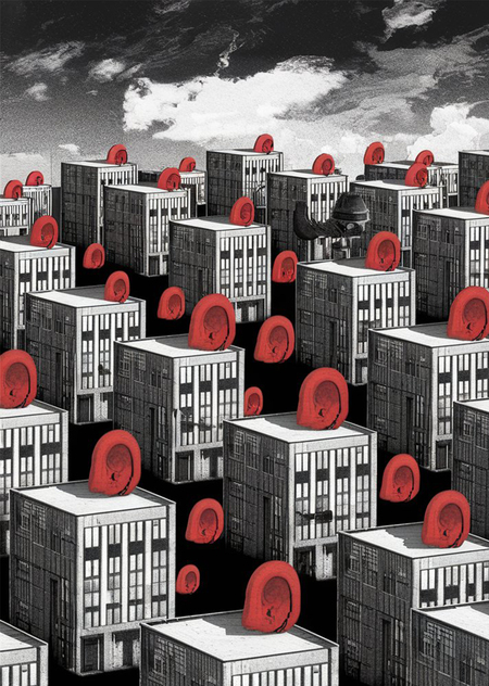 a minimalistic shop with a title 'I hear anything' in black grey white and red colors with high soviet panel houses