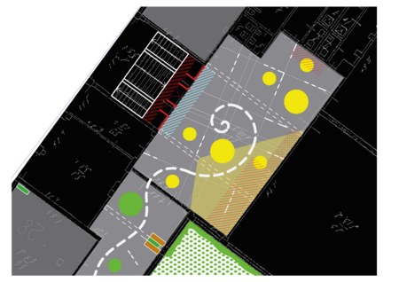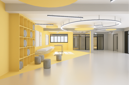 Подчеркивать ритм ригелей в коридоре представляется нецелесообразным, так как их расположение не несет художественного, композиционного смысла — они строго конструктивны. Тем более, что они своей формой (прямоугольные рамы) ни в коем случае не добавляют разнообразия всем остальным прямоугольным элементам. Есть смысл в введении в это «царство непропорциональных прямоугольников» плавны линий, окружностей и т. п. форм и силуэтов. Таким образом появилась идея плавной линии освещения, огибающая фрагменты подвесных потолков круглой формы, а также сворачивающаяся в центре холла в спираль золотого сечения, последовательность чисел Фибоначчи.
