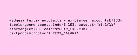 Круговая диаграмма отражает разнообразие жанров и их относительную популярность. Экшн и комедия, являясь самыми популярными, занимают большую часть, доминируя в индустрии. Однако можно увидеть и разнообразие менее популярных жанров, что говорит о широте интересов аудитории, готовой исследовать разные типы контента.