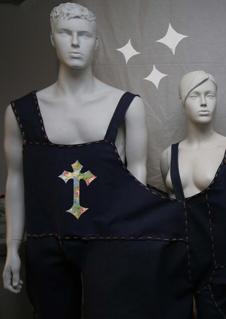 Так-же важным элементом в этом объекте являются кресты и звезды пришитые к комбинезону, вырезанные из тонкой ткани с цветочными узорами. Крест и звезда в данной ситуации являются безобидным модными символами, в которые были превращены некогда важные столпы в жизни человечества, символ веры, и так-же символ божественных сил космических тел. Это, по моему мнению, произошло под пластом наслоения самой на себя культуры нашей цивилизации.