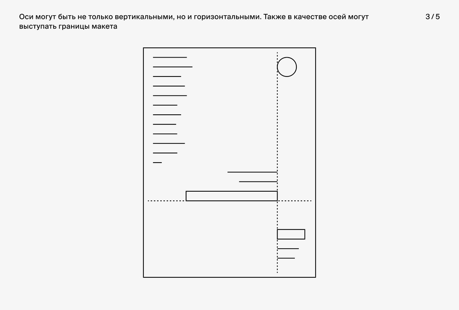 — Оси это невидимые силовые линии макета, которые структурируют его композицию. В старинных макетах, как правило была только центральная вертикальная ось, иногда к ней могли добавиться границы макета. В современных композициях осей может быть много, они могут стоять асимметрично и расположенны не под прямым углом