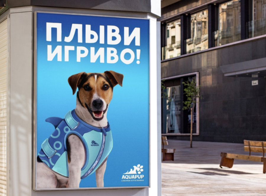 Prompt: a large banner on the street with a large headline «AQUAPUP» and the inscription «dog swimsuits shop»