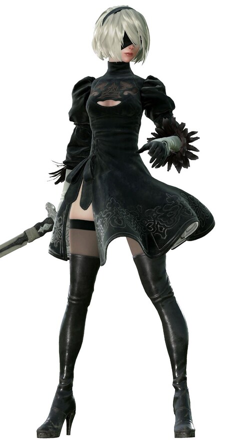 Ее образ сексуальный, но, при этом, не вульгарный. 2В красивая и привлекательная, но при этом очень элегантная и сильная. Руки защищают перчатки, декольте прикрывает полупрозрачная ткань, а обувь доходит почти до бедер.