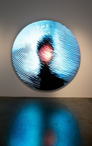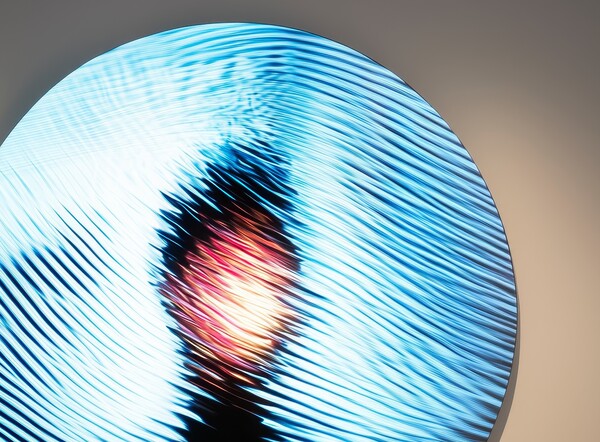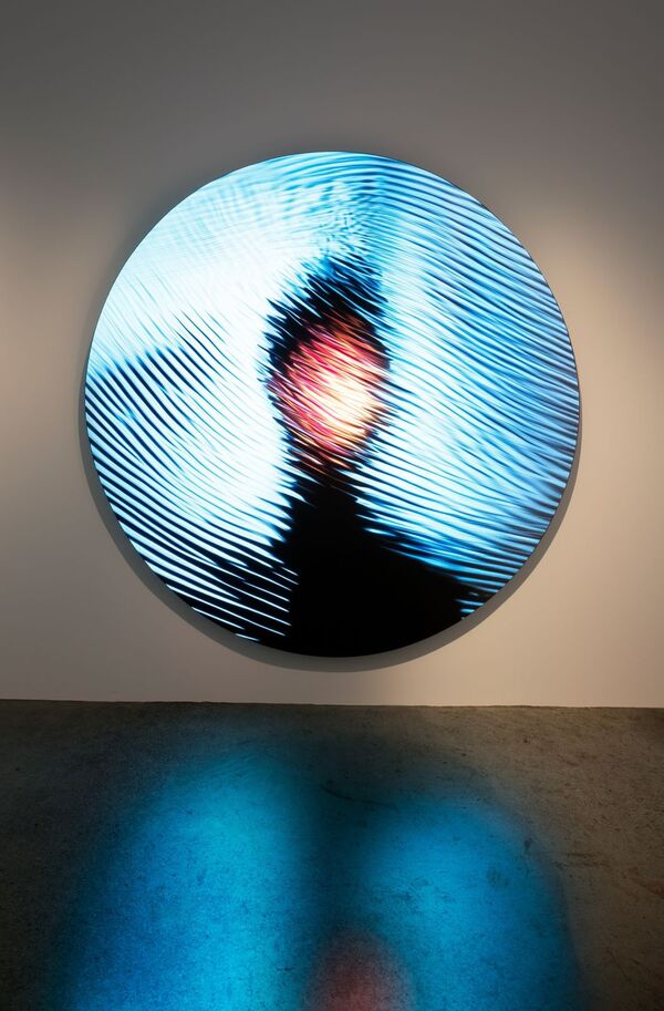 Вторая инсталляция — это экран, установленный на стене или на полу. Он отражает зрителя, обработав изображение в реальном времени нейросетями через связку TouchDiffusion и StreamDiffusion