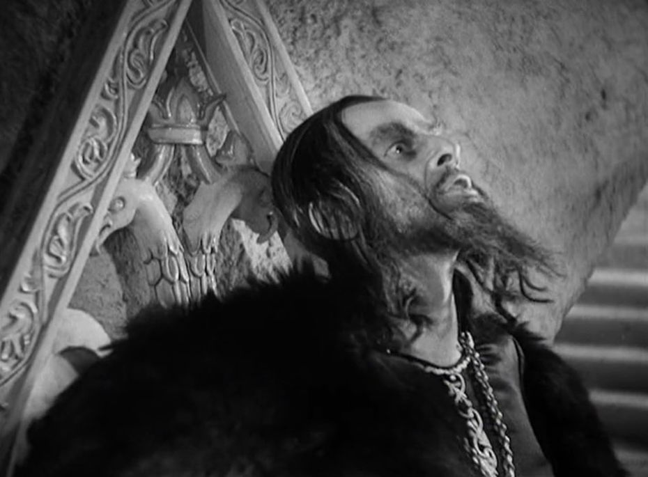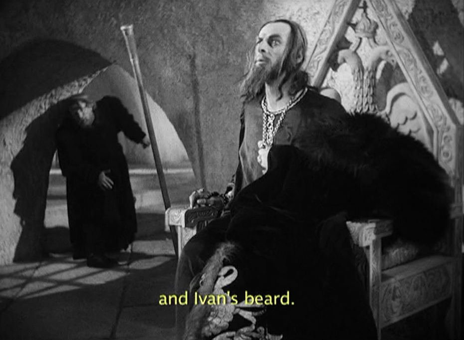 И вот в эту напряженную беседу вдруг влезает борода Ивана, неладная аляповатая, торчащая, режущая кадр то так, то эдак, отвлекающая зрителя «от действия». В некотором смысле, она-то и есть средоточие всего разговора, главная претензия к Эйзенштейну, ключевой символ сталинского кинематографа, слишком многозначительный, чтобы браться его интерпретировать. Неудовлетворенность бородой Ивана и обещание ее укоротить, несомненно, большая находка для мира абсурда. Реплика, которую стоило бы выдумать, да только вот она и без того прозвучала.