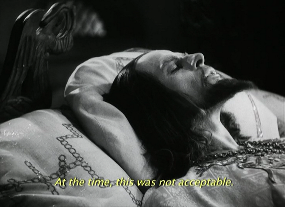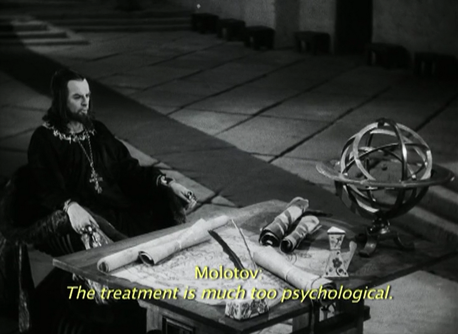 И вот, ту же историю берется в некоторой степени рассказывать Пьер Леон. Рассказывать на французском, что придает ему выразительную отстраненность (хотя бы уже на уровне имен, рефреном звучащее «Tcherkasoff», «Zhdanoff») и особенный угол обзора. О чем же слышится эта история во французском пересказе Леона? Все присутствующие понимают — с картиной Эйзенштейна определенно что-то не так, но словно не до конца осознают, что именно и увлеченно пытаются это разгадать, осыпая режиссера пробными замечаниями. Такая игра хорошо знакома Жданову и Молотову, им, всегда стремящимся предвидеть помыслы вождя. Но и в Сталине поначалу чувствуется доля неуверенности, он вроде бы ищет в Эйзенштейне неподдельного союзника, но не решается найти. Если это и напоминает шахматную партию, то такую, где каждый не совсем осознает своей цели и ходит с вечной оглядкой, нет поставлен ли ему шах (о чем никогда нельзя сказать наверняка).