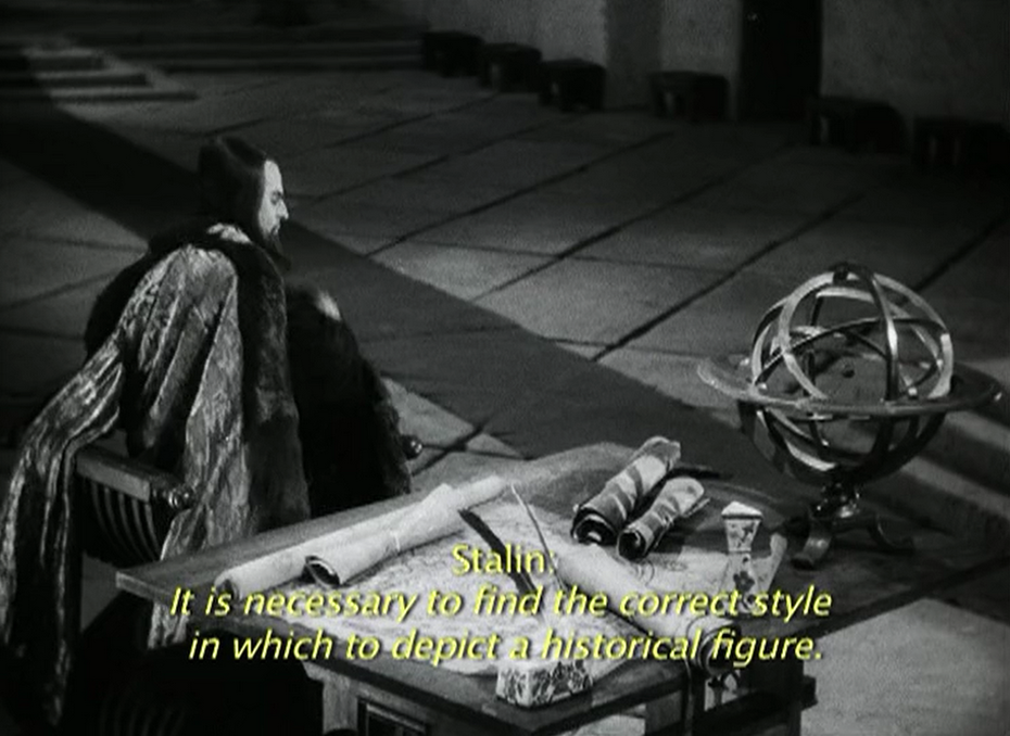 Осталась, разумеется, и ключевая фраза всей беседы, в которой Сталин настаивает на том, что не дает никаких указаний, а высказывается, прежде всего, как зритель. Притом зритель чудовищно цепкий, от чьего внимания не ускользает почти ничего, это хорошо заметно уже по одному этому разговору. К 1947-му году он стремится стать уже более, чем просто восприимчивым, но уже идеальным, эталонным зрителем своей страны. Захватить монополию не на что иное, как на сам взгляд. Тот самый, которым герои Пырьева, затаив дыхание, окидывают сибирские стройки, тот, которым видят их зрители в кинотеатре, тот, которым смотрят на природу, на возлюбленную, да собственно уже и не важно на что, вся суть вновь в глазах смотрящего. Или, как это здесь называет Сталин, отчитывая Эйзенштейна, в стиле. «Режиссер может отступать от истории…» — разрешает вождь, практически заново придумывая свою давнюю мысль о том, что главное учитывать «переходы и передвижения в рамках одной формулы». А значит неважно «что» и даже «как» показывать, главное, чтобы глаза самого проводника не выходили за рамки заданной формулы, соответствуя представлениям одного кремлевского зрителя.
