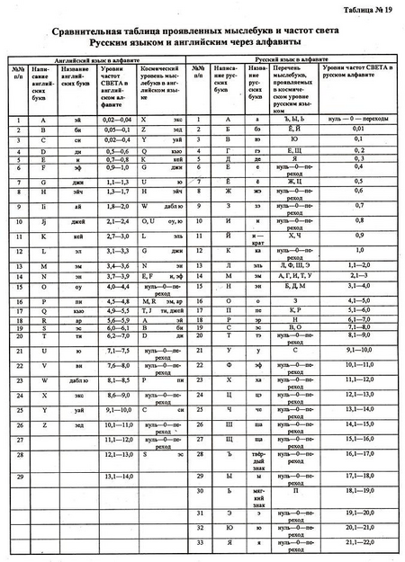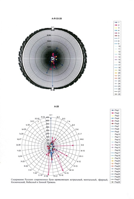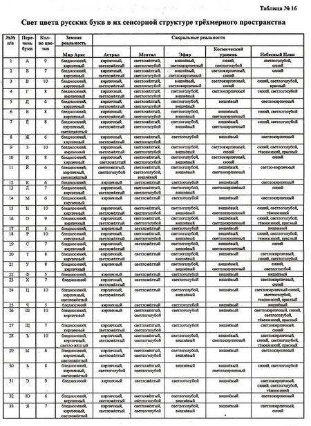 Уточнение цветовых слоёв русских букв, их числовых значений: порядковый номер, число материализованных букв, число материализации, частоты дематериализации, угол поляризации, угол вращения в градусах, частота мыслебуквы, уровни частот СВЕТА в русском алфавите, частоты меры различения (которые и складывают знакомые нам порядковые номера) позволило сформировать профессору А. А. Свиридову графические лики букв.