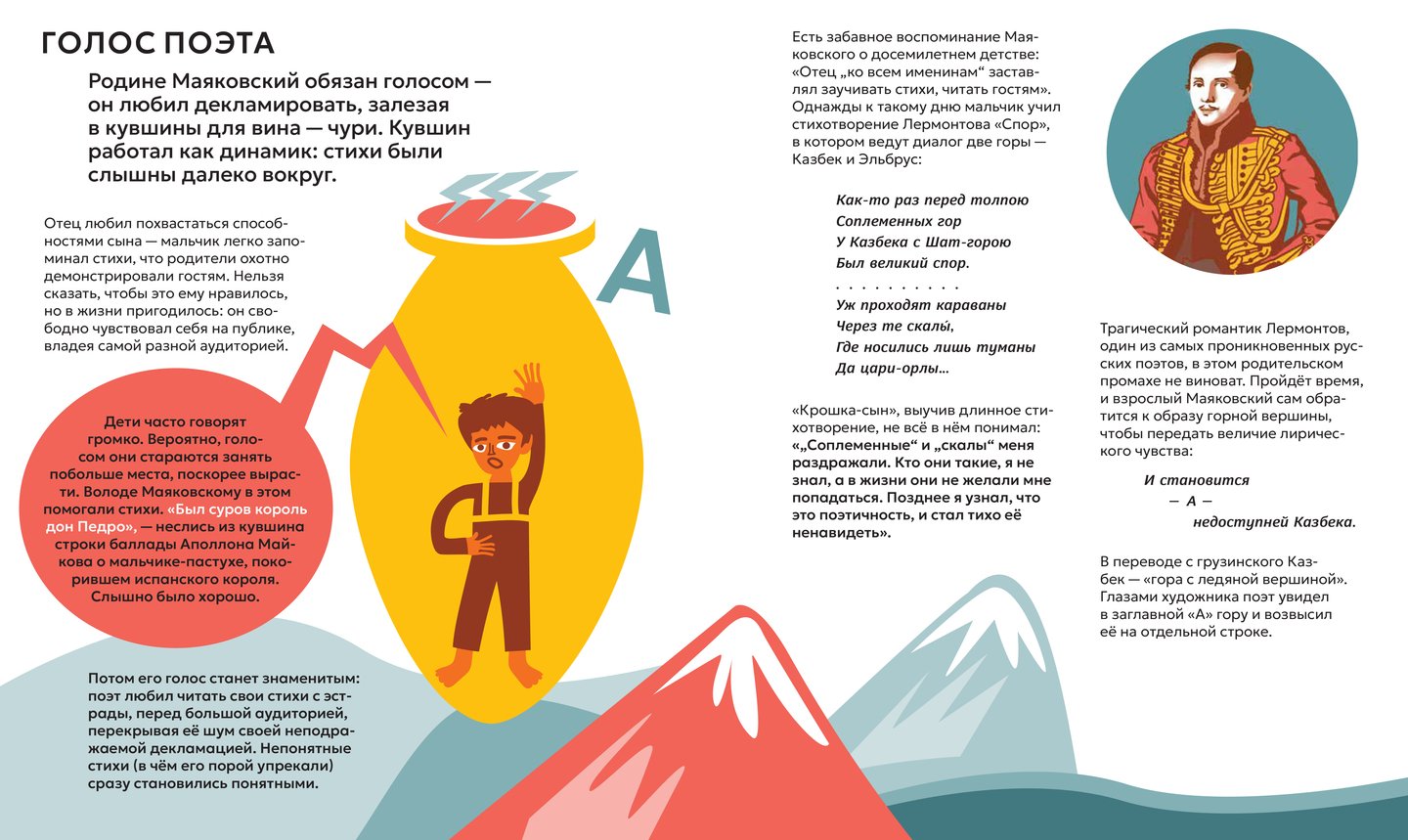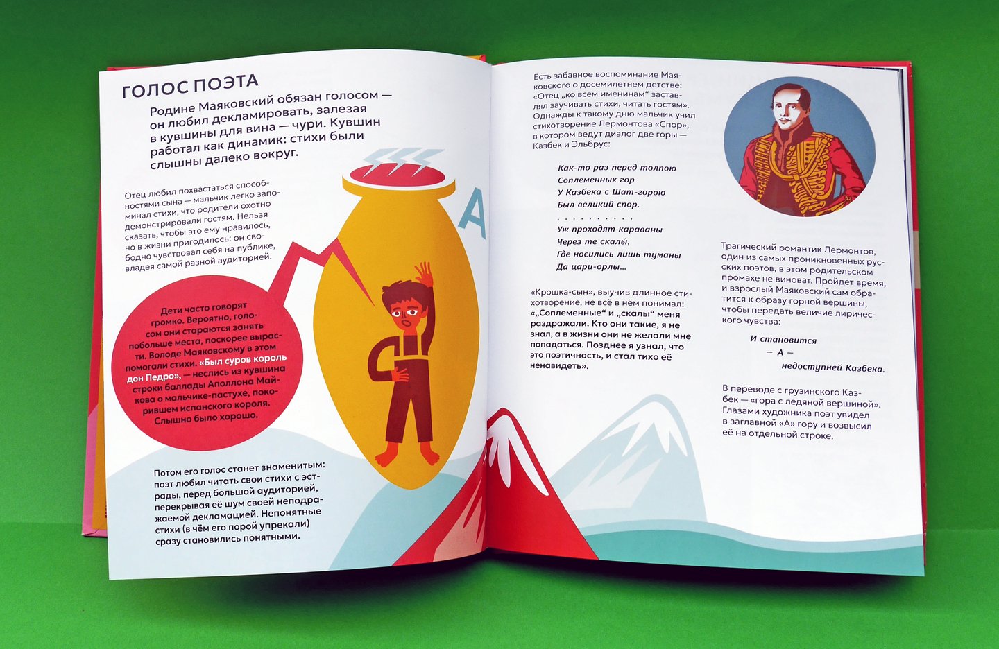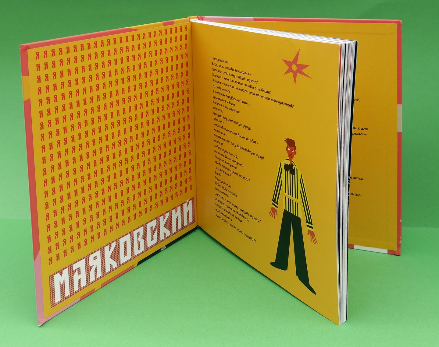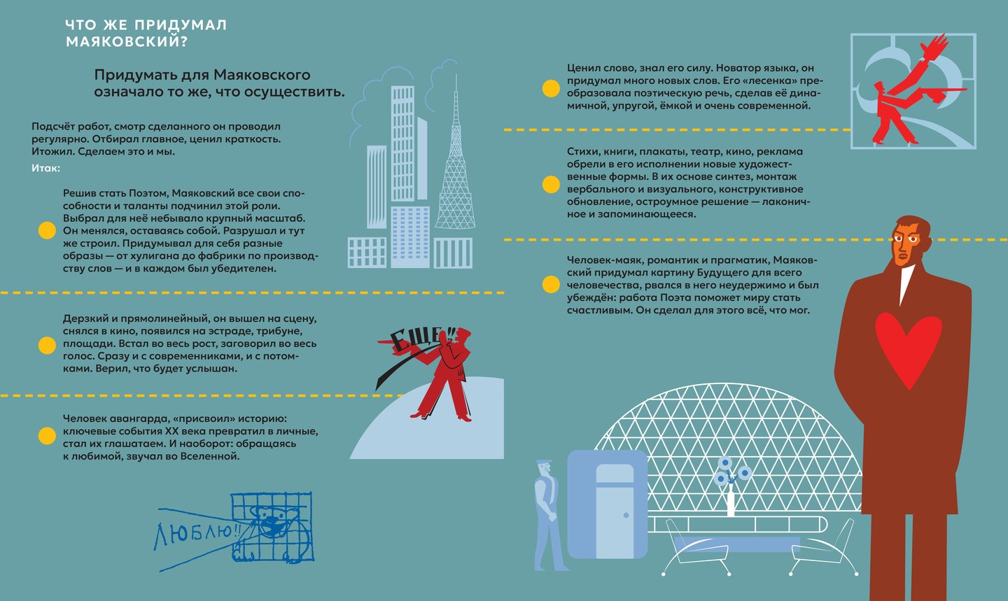Маяковский — футурист и фантаст, художник и поэт, стиль иллюстраций должен был поддерживать тексты и идеи. Текст выстроен хронологически, но цветные развороты выделяют отдельные темы в жизни поэта.