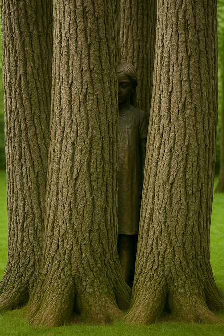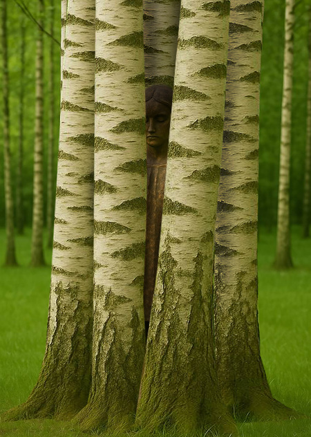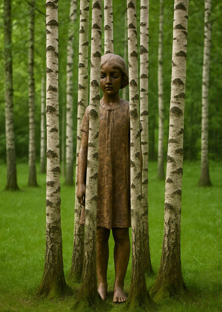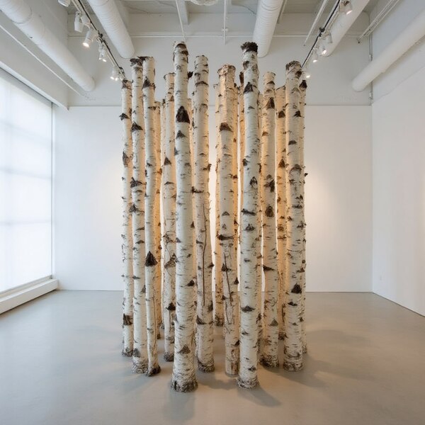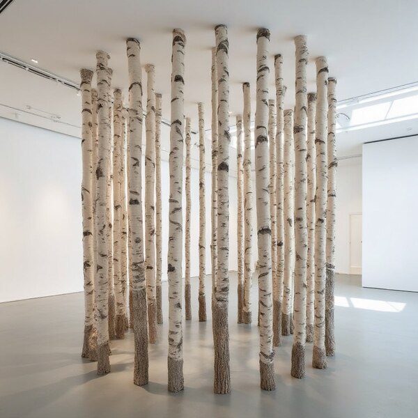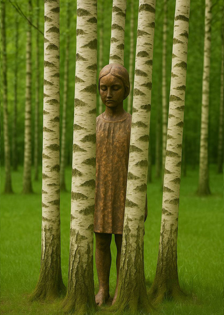 высота скульптуры 140 см, высота стволов меняется в зависимости от локации размещения. варианты материалов: 1. скульптура дерево + живые деревья, 2. скульптура бронза + живые деревья 3. Партиципаторная инсталляция только из стволов деревьев