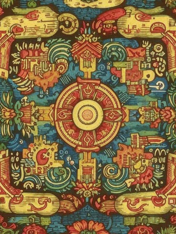 Промпт: узор для платка квадратный 2д цветной карандаш штрихи узоры черепица тайские мотивы дерево растения орнаменты Нейросеть: Kandinsky