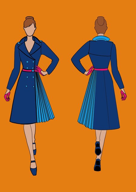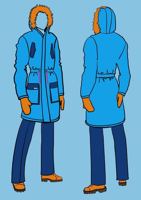 Мужской демисезонный плащ из тёмно-синей плащевой, водоотталкивающей ткани, возможно, из переработанного пластика. На кулиске — ярким акцентом станет хлопковый шнур 10 мм С большими накладными карманами в области бедер с контрастными голубыми клапанами На груди функциональные карманы, а на клапане вышитое лого авиакомпании Оранжевая подкладка, забрендированная мелким паттерным рисунком с названием авиакомпании Перчатки оранжевые вязаные Ботинки похожие на Timberland