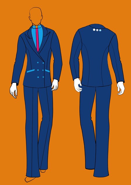 Двубортный мужской жакет с контрастными карманами спереди. Пуговицы на ножке обтянуты тканью в тон. Сзади у шеи вышивка логотипа авиакомпании Брюки с отстроченными стрелками