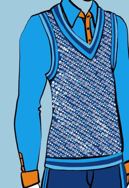 Зимняя мужская униформа: Рубашка с контрастной планкой и манжетами (хлопок, вискоза, п/э) Вязаный жилет с паттерным принтом логотипа авиакомпании (вискоза 60%, нейлон 40%) Шерстяные брюки с лампасами из репсовой плетеной ленты в фирменных цветах