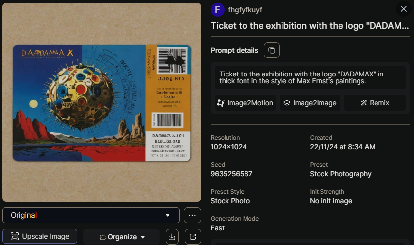 Билет для выставки, созданный с помощью ИИ / промпт билета.