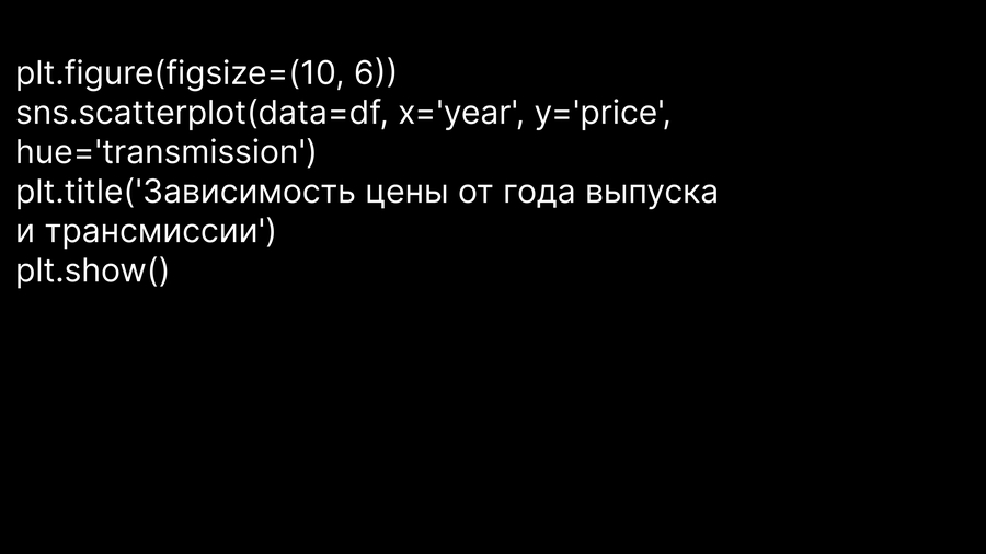 4. Диаграмма рассеяния (для визуализации зависимости цены от года выпуска, позволяя проанализировать изменение стоимости автомобилей с течением времени).