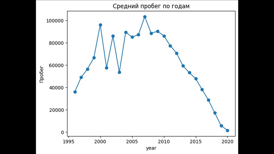 5. Линейный график (для иллюстрации динамики пробега по годам выпуска, что помогает отслеживать тенденции и изменения в использовании автомобилей).