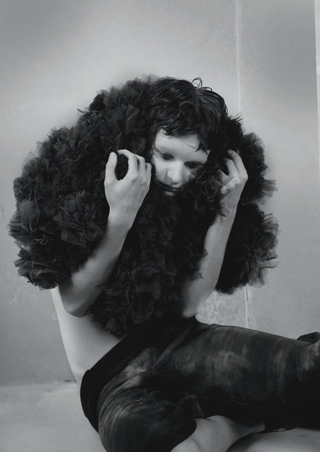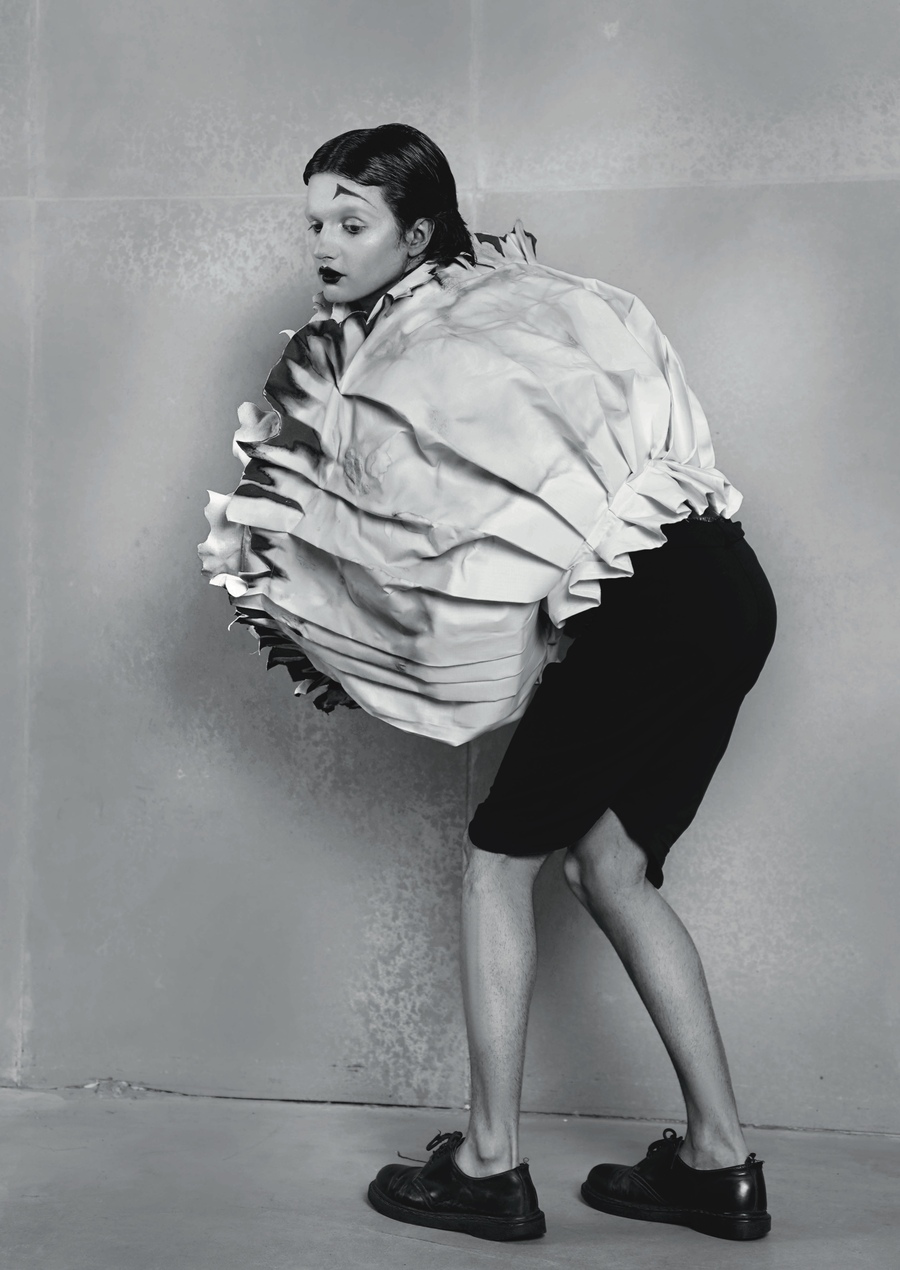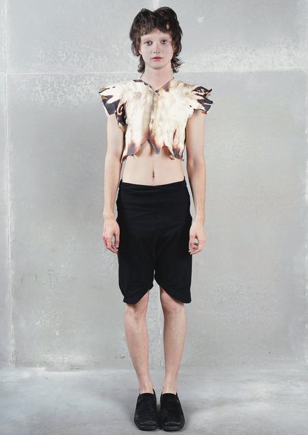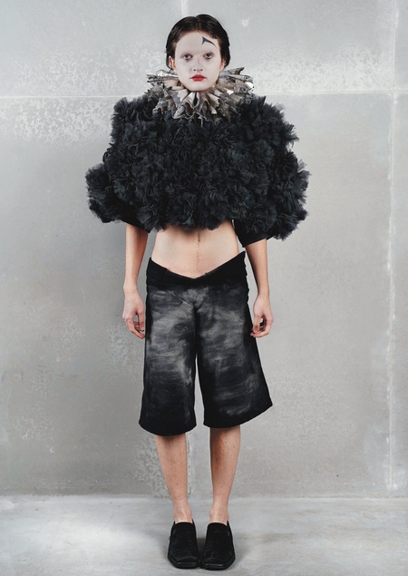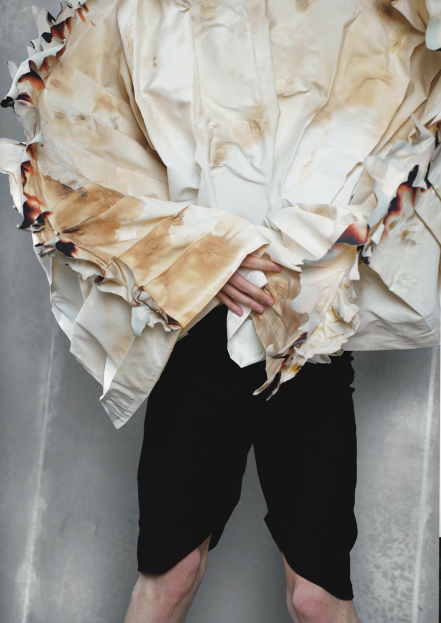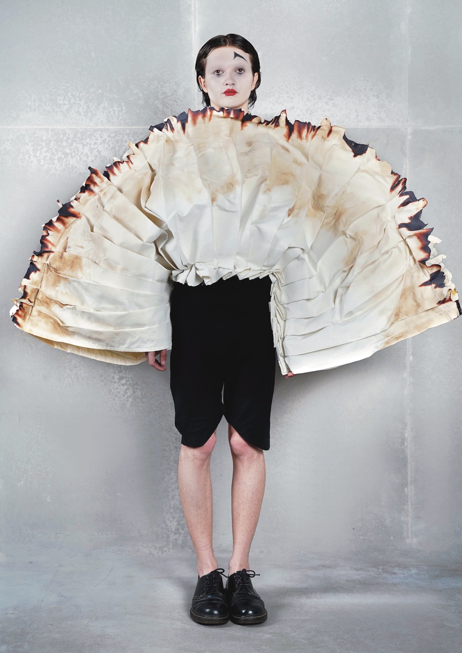 Этот феномен переломной точки, в которой происходит метаморфоза, я и рассматриваю в своем проекте, работая в эстетике flamboyant, используя пепел как символ конкретно момента перехода, когда будущего еще нет, но и прошлое уже начинает сгорать. Также я обращаюсь к образу Пьеро — грустного клоуна, традиционного символа раскаяния и одиночества, беру его узнаваемые элементы, гипертрофирую и разрушаю с помощью огня.