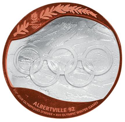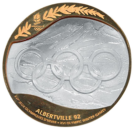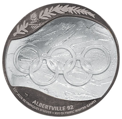 Аверс: на хрустальном элементе — олимпийские кольца на фоне горного пейзажа. Над ней гравировка: стилизованная лавровая ветвь, эмблема Игр в Альбервиле и олимпийские кольца. Внизу по кругу текст на французском и английском языках: ALBERTVILLE 92 XVIes JEUX OLYMPIQUES D’HIVER — XVI OLYMPIC WINTER GAMES (Альбервиль 1992 XVI Олимпийские зимние игры).