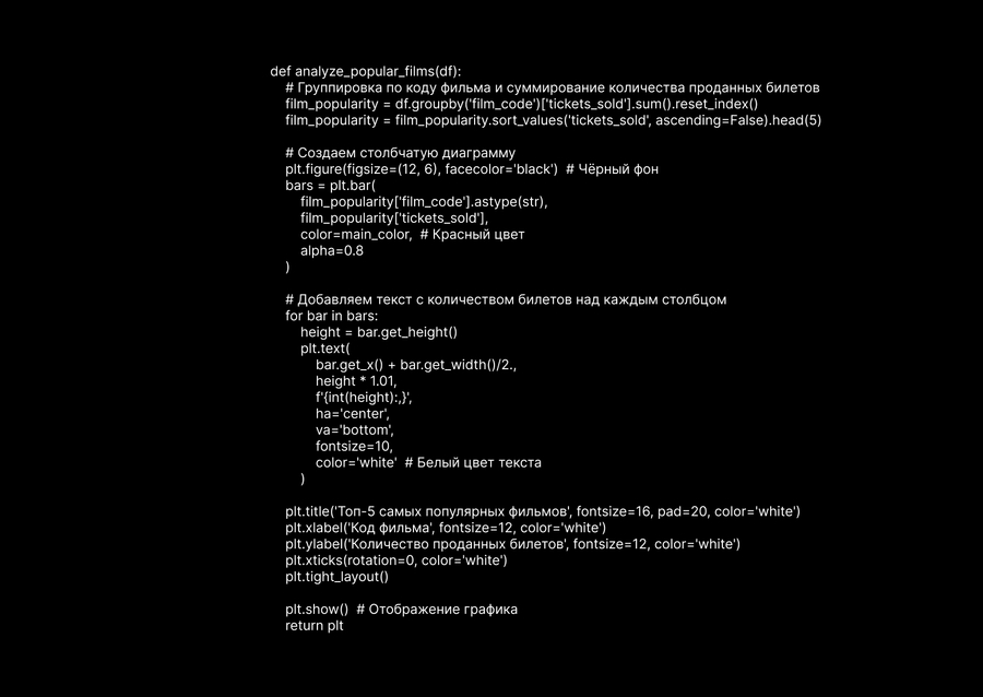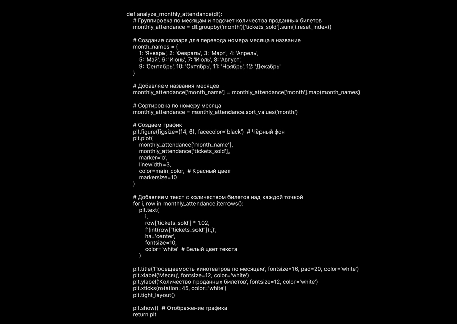 - Существует сильная сезонность в посещаемости кинотеатров. - Значительная доля продаж приходится на ограниченное число блокбастеров. - Время показа и день недели сильно влияют на заполняемость залов. - Ценовая политика адаптирована к спросу, с повышением цен в пиковые дни.