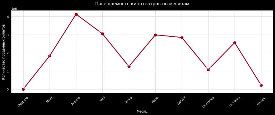 Пик посещаемости пришелся на апрель, когда было продано около 4,1 миллиона билетов, за ним следует май с результатом в 3,0 миллиона билетов, что делает его вторым по популярности месяцем; при этом наименьшая посещаемость зафиксирована в феврале, что может быть связано с неполными данными за этот месяц, а также наблюдается сезонность с повышенным интересом зрителей в весенние и осенние месяцы.