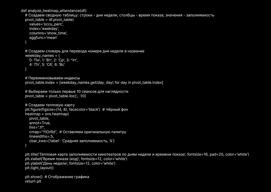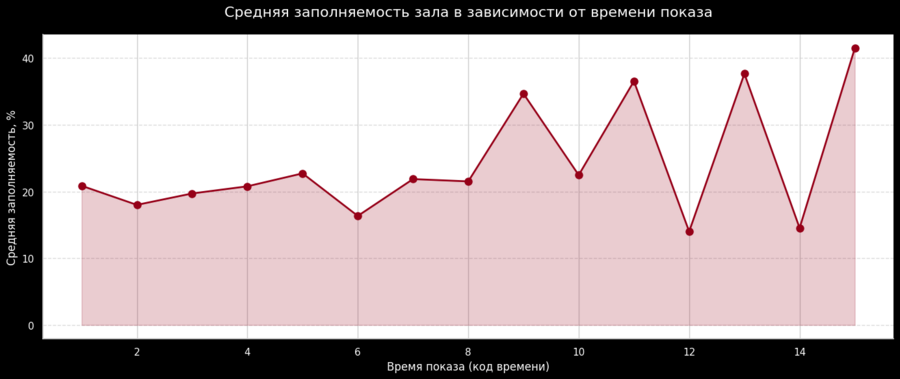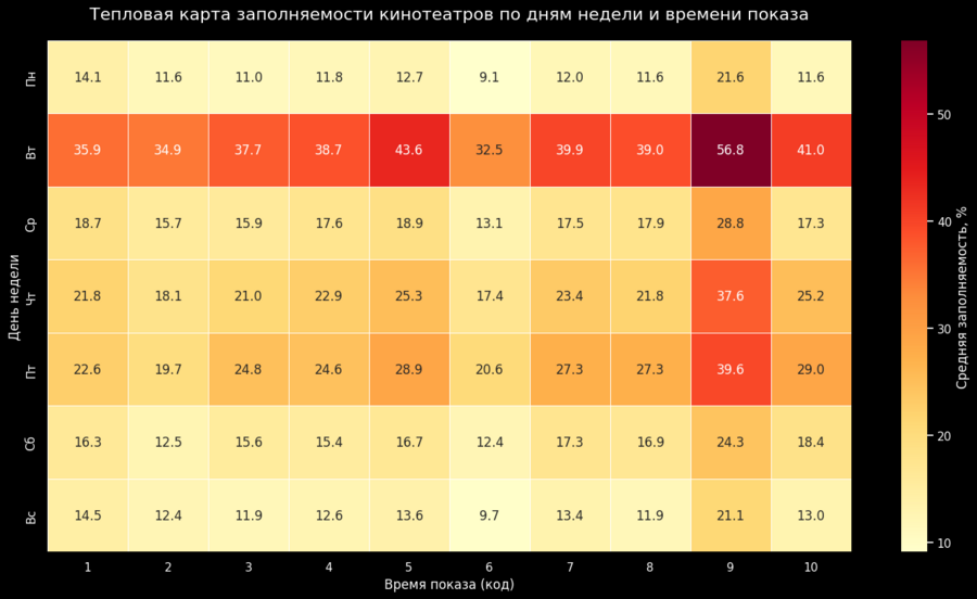 Наивысшая заполняемость наблюдается в выходные дни (суббота и воскресенье) в вечернее время, тогда как в будние дни пик посещаемости также приходится на вечерние сеансы; при этом утренние сеансы в понедельник и вторник демонстрируют самую низкую заполняемость. Кроме того, выделяются «горячие точки» — определенные комбинации дня недели и времени показа, которые обеспечивают максимальную заполняемость залов.