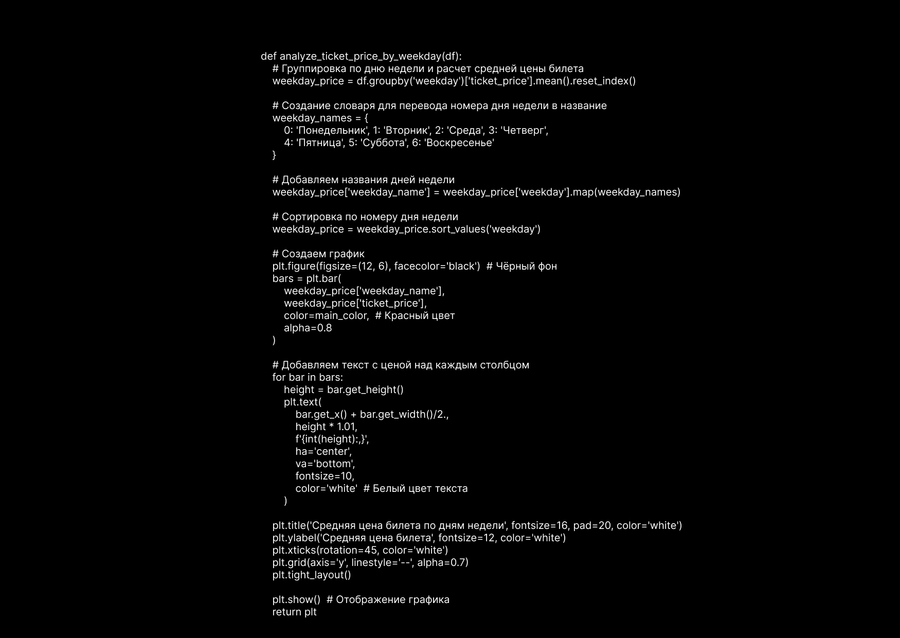 Наиболее высокие цены на билеты зафиксированы в пятницу и субботу, тогда как самые низкие цены наблюдаются в середине недели, особенно в среду; разница между максимальной и минимальной средней ценой составляет около 25%, что подтверждает зависимость цен от спроса — они выше в выходные дни, когда посещаемость возрастает, и ниже в будни, когда зрительская активность снижается.