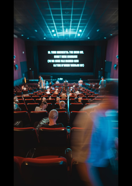 Промт к обложке: Image depicts an indoor cinema setting with a focus on the back of cinema. The style is candid and slightly blurred, capturing a moment of transition. The layout features rows of red cushioned seats, with a few people scattered throughout, some seated and others standing. The screen at the front displays white text credits against a black background, typical of movie end credits, with the text aligned centrally. The lighting is low, creating a subdued atmosphere. A person in the foreground, slightly out of focus, appears to be moving, wearing a light-colored shirt and a cap. The overall ambiance suggests the end of a film screening, with patrons beginning to leave their seats.