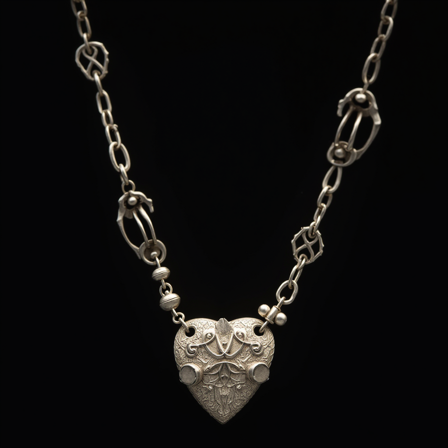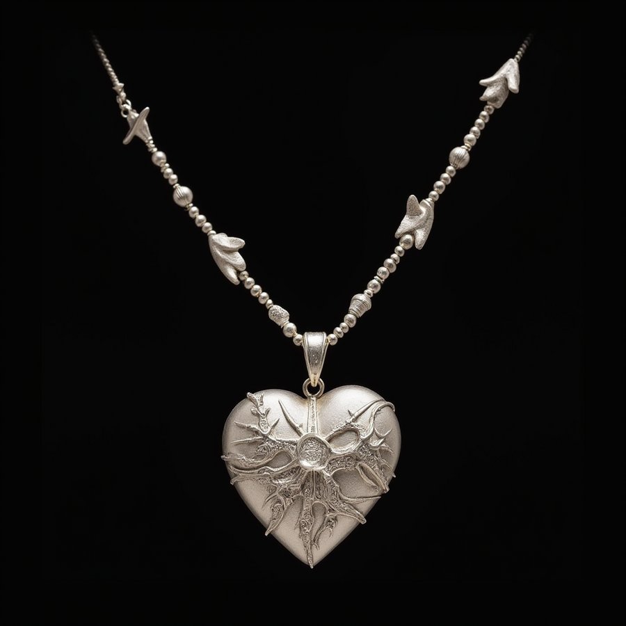 prompt: silver necklace with a heart-shaped pendant surrounded by a floral pattern, necklace is made up of small round beads that are attached to a thin silver chain, black background. High resolution --sref
